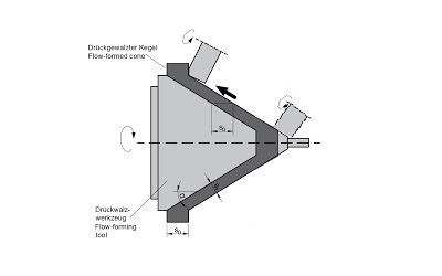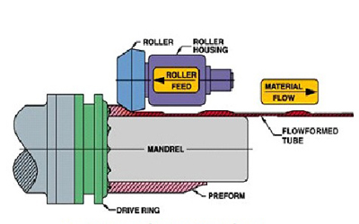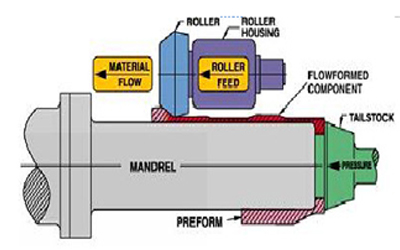 Flow forming is simply a cold forming process by which a thick-walled cylindrical cup called a preform is stretched over a rotating mandrel by three forming rollers, which are arranged equidistant, and at 120 degrees to each other. Six world-class flow-forming machines to maintain the delivery requirements of customers.